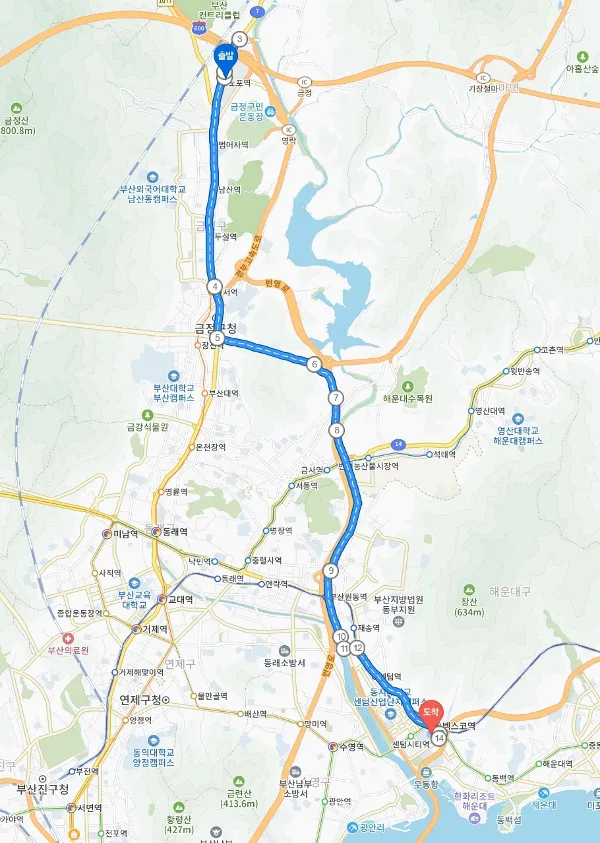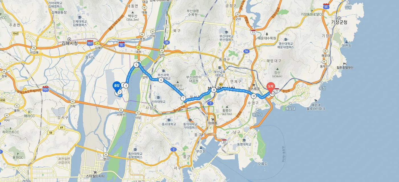 부산종합버스터미널에서 승용차, 택시 등 차량을 이용해서 이동하는 경우 아래의 경로로 이동하는 것이 가장 빠르게 도착할 수 있으며 평균적으로 50분 정도 걸리지만 교통 상황에 따라 달라질 수 있습니다.