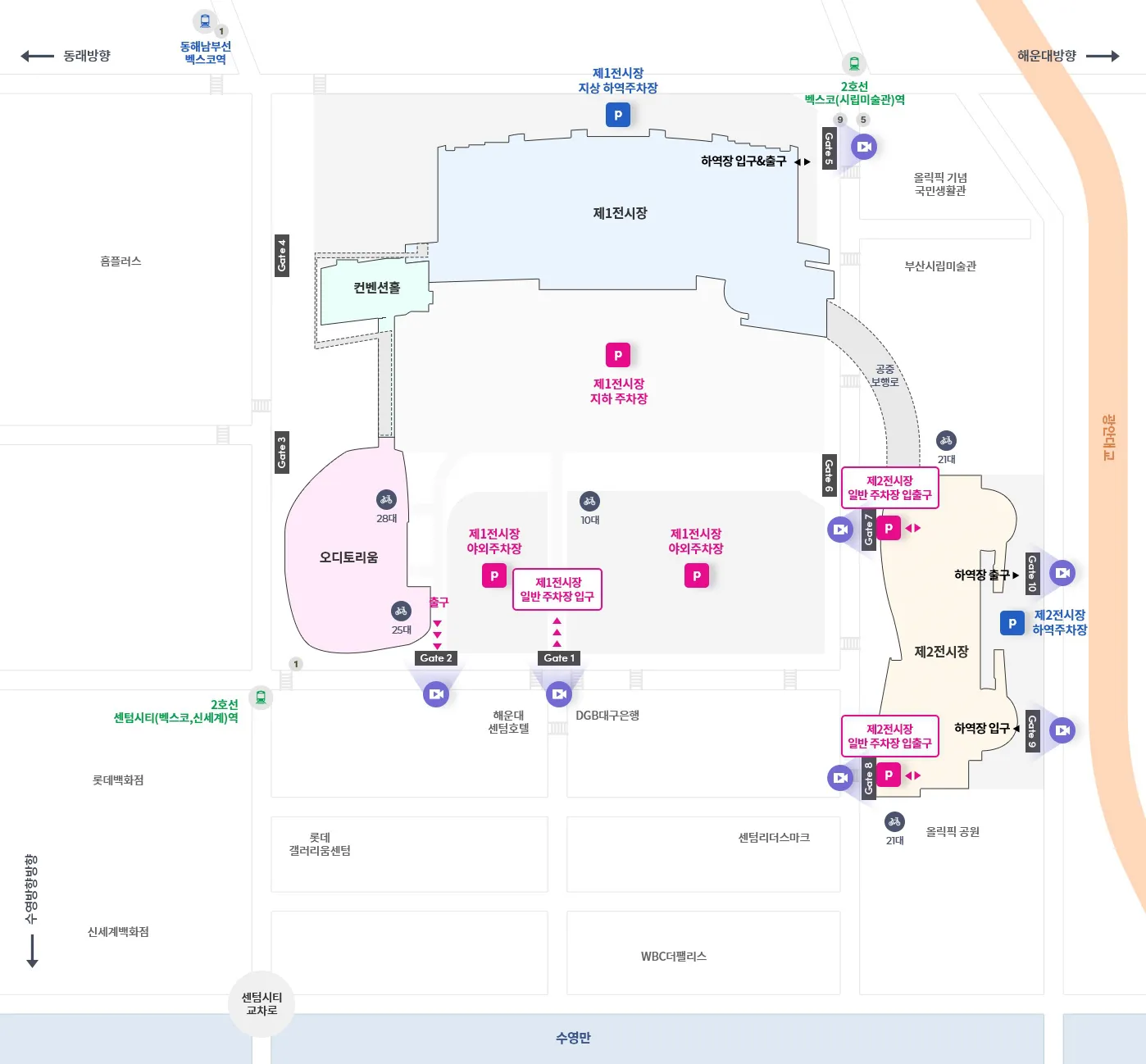 차량을 이용해서 직접 벡스코를 방문하시려면 가려는 전시장의 위치 및 주소, 주차장 시설에 대해서 미리 알고 가는 것이 좋습니다. 각 전시장 주소는 아래에 있으니 참고해 주세요.