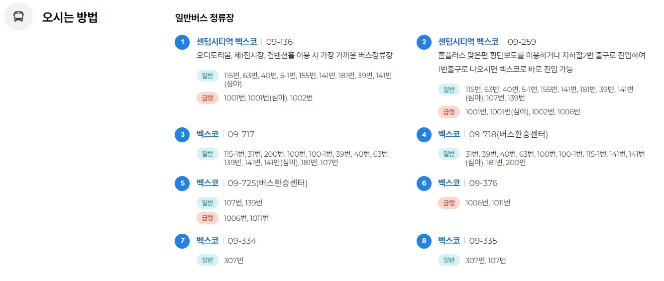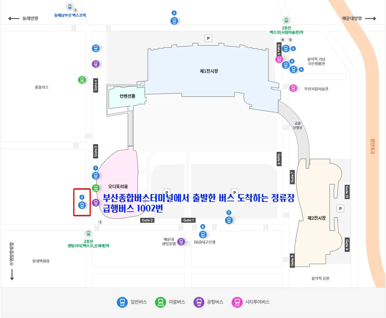 부산종합버스터미널 버스정류장에서 급행버스 1002번을 이용하거나, 부산 지하철 1호선을 타고 가다가 서면역에서 2호선으로 환승해서 센텀시티역에서 내리면 됩니다.