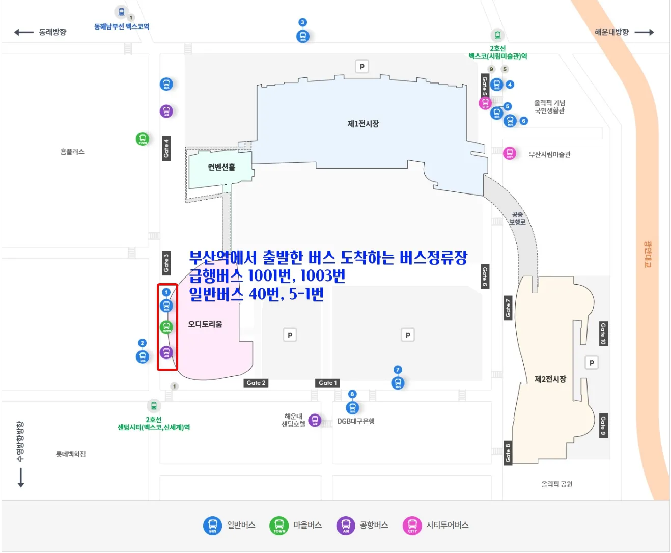 부산역 버스정류장에서 급행버스 1001번, 1003번, 일반버스 40번, 5-1번을 이용하시면 벡스코까지 환승하지 않고 한 번에 갈 수 있으며, 지하철을 이용하시는 경우에는 부산 지하철 1호선을 타고 가다가 2호선으로 환승을 해야 합니다.